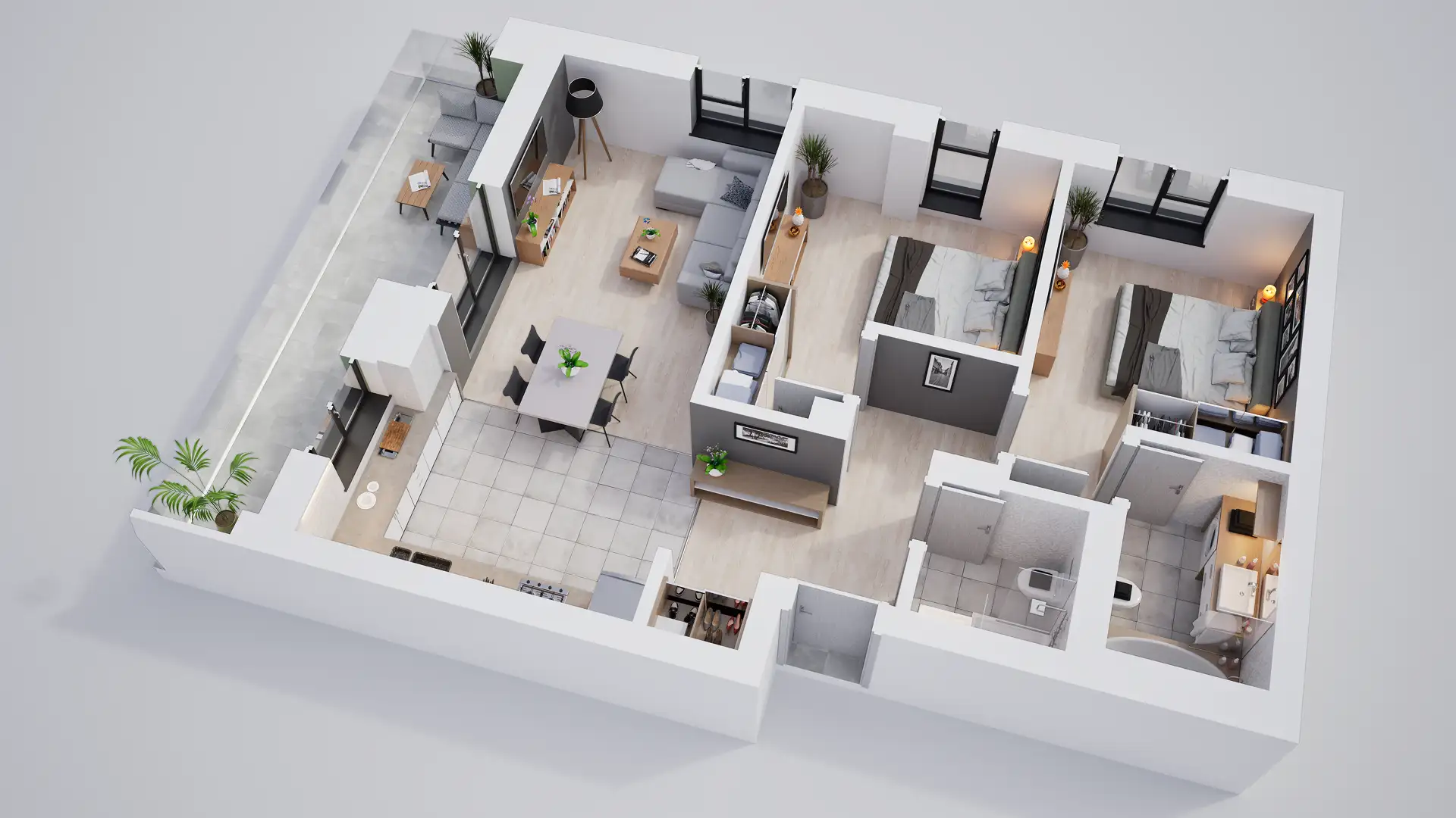 • Terase/Balcoane cu parapet din sticlă securizată, placate cu gresie;
